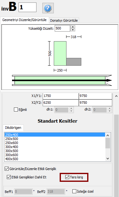 Döşemelerin tanımlanmasından sonra, kirişlerin Özellikler Penceresi'nde iki ek seçenek belirebilir: (i) kirişin efektif (etkili) genişliğini hesapların içine dahil etmeyi veya etmemenin seçilmesi ve (ii) kirişin ters çevrilip çevrilmeyeceğinin seçilmesi. Efektif (etkili) genişlik, program tarafından otomatik olarak hesaplanır ancak kullanıcı tarafından da değiştirilibilir.