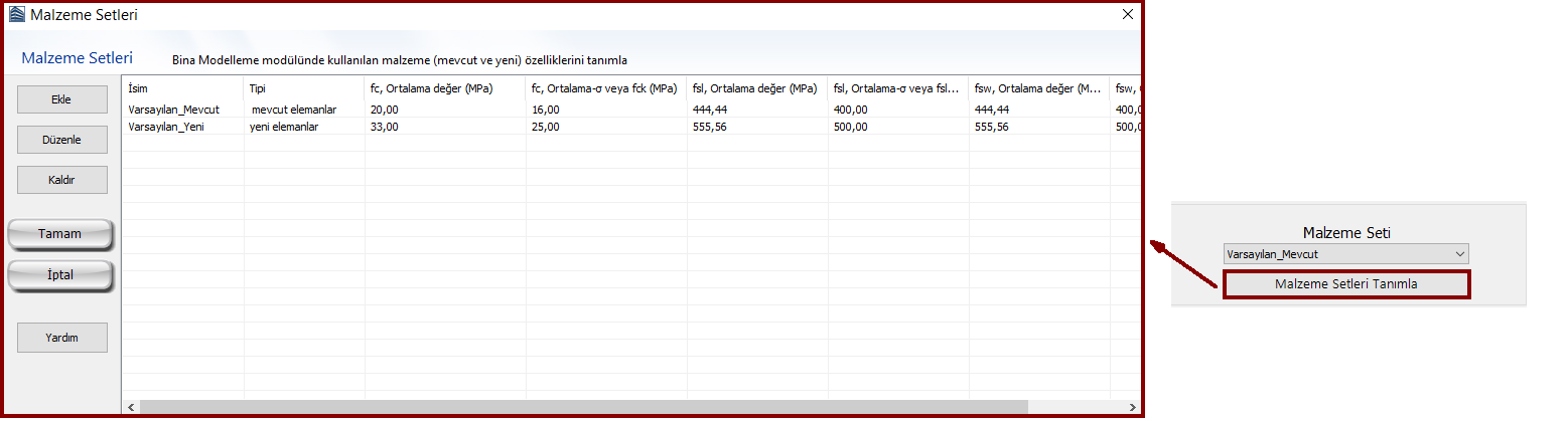 ) veya elemanın Özellikler Penceresi içerisindeki Malzeme Setlerini Tanımla düğmesi aracılığıyla tanımlanabilir. Mantolanmış elemanlarda, biri mevcut elemanlar için diğeri ise yeni elemanlar için olmak üzere, iki farklı beton malzemesi tertibi vardır.