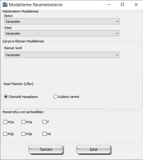 Yapısal elemanın modelleme parametreleri, ilgili düğmeden açılan Modelleme Parametreleri iletişim kutusu aracılığıyla da tanımlanabilir.