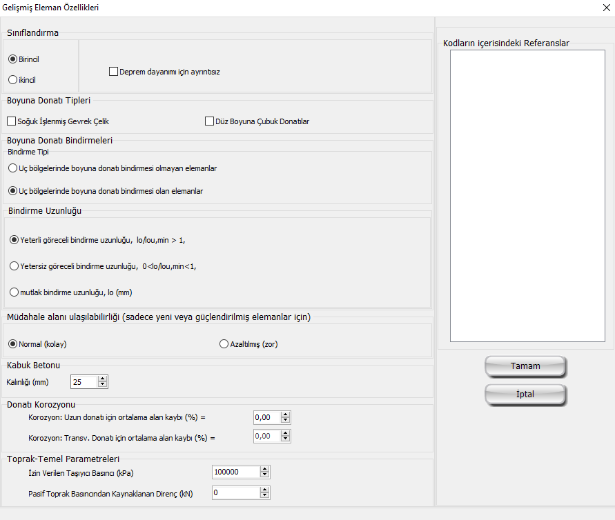 Yapısal elemanın kod tabanlı ayarları, ilgili düğmeden açılan Gelişmiş Eleman Özellikleri iletişim kutusu aracılığıyla tanımlanabilir.