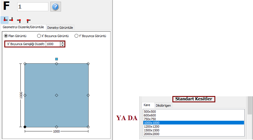 Kullanıcılar, tekil temelin Özellikler Penceresinde ya Görünüm/Geometri Değiştir penceresinden ya da önceden tanımlanmış standart bölümlerden bir bölüm seçerek bölümün boyutlarını uyarlayabilirler.