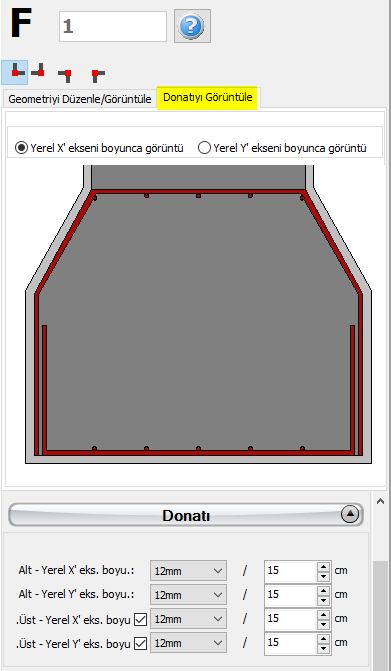 Donatı modelleri düzenlenirken program otomatik olarak Donatı Görüntüle ekranına geçer, burada kesitin donatısı gösterilir ve kullanıcılar doğru atamayı kontrol edebilir.
