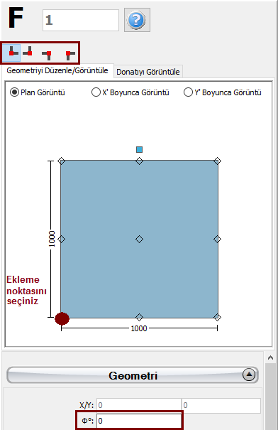 Son olarak, ekleme noktası (kesitin fare tıklamasının konumuna karşılık gelen noktası) Özellikler Penceresinde kesitin çiziminin köşe, orta veya yan noktalarına tıklanarak seçilebilirken, kolonun plan görünümündeki dönüşü 0o, 90o, 180o ve 270o düğmeleriyle veya Özellikler Penceresinin ilgili düzenleme kutusunda uygun açı atanarak değiştirilebilir.