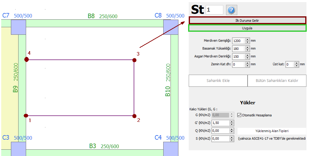 Merdiven, merkez çizgisi belirtilerek kolayca tanımlanabilir. Merkez çizgisinin köşe noktalarının tanımlanmasının ardından, tanımı sonlandırmak için Uygula düğmesine, tekrar tanımlamak için Yenile düğmesine tıklanır.