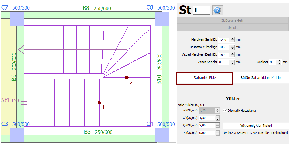 Merdiven elemanının projeye eklenmesinden sonra, sahanlıklar eklenebilir. Bu işlemi gerçekleştirebilmek için, merdivenleri seçip, Sahanlık Ekle düğmesine tıklayınız. Sahanlığın iki uçu grafiksel olarak merkez çizgi üzerinde belirtilmelidir. Tanımlanmış sahanlıklar Bütün Sahanlıkları Kaldır butonu aracılığıyla kaldırılabilir.