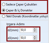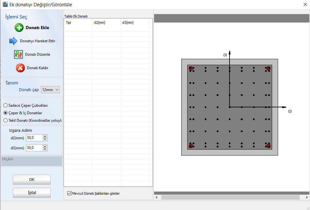 - Izgara özellikleri tanımlanmalı (sol panel seçenek 1&2-ızgaranın tüm keside yayılı mı yoksa sadece kesit çevresinde mi bulunacağını belirtir, sol panel seçenek 3-Alternatif bir tekil donatı seçeneği sunar; sağ panelden de ızgara adımları tanımlanır);