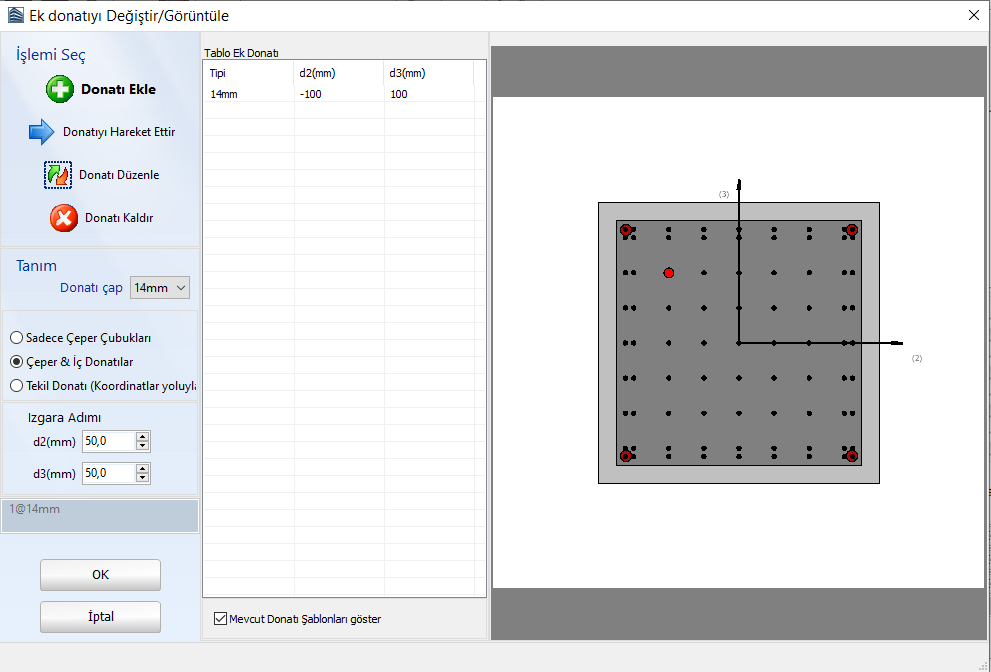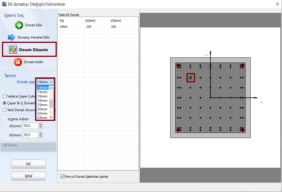 Kullanıcılar, ek donatıları Seç/Düzenle çubuk düğmelerine tıkladıktan sonra ilgili donatıyı seçip ek donatıyı düzenleyebilir ve çapını değiştirebilir.