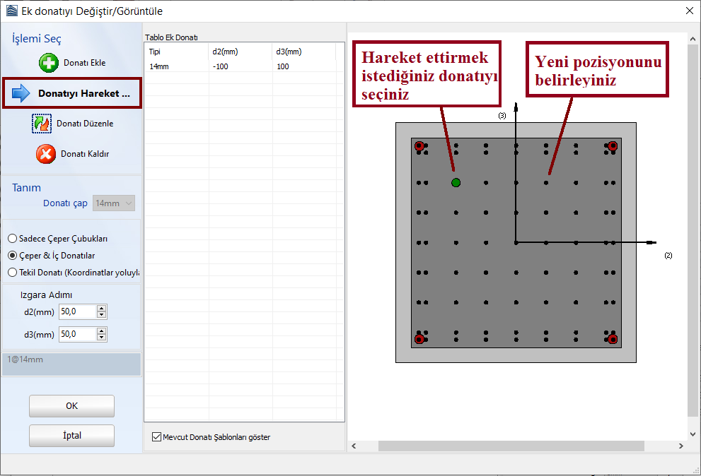 Son olarak, donatılar Donatıları Hareket Ettir düğmesine tıklanarak farklı koordinatlara taşınabilir. Kullanıcılar, donatıyı seçip, yeni konumu görsel oalrak seçebilir.