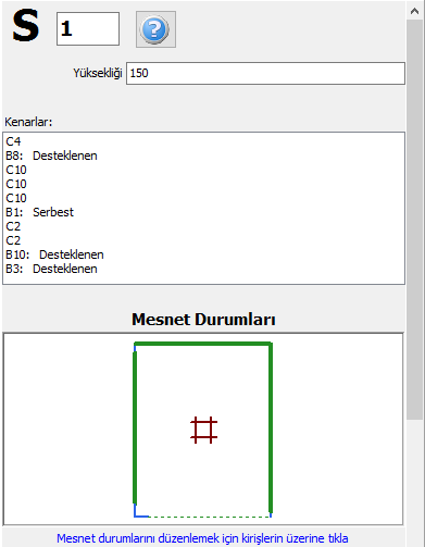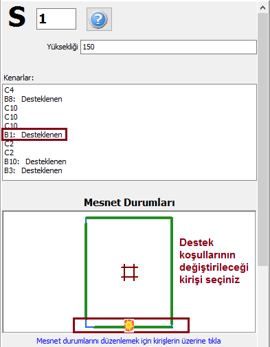 Döşeme tanımlandıktan sonra, döşeme yüklerinin dağıtılacağı kirişleri belirleyen destek koşulları, Özellikler Penceresi'ndeki ilgili sınırlara tıklayarak değiştirilebilir. Bu işlemi gerçekleştirmek için; döşeme seçilir, Özellikler Penceresinde bulunan Destek (mesnet) koşulları kısmından kirişlere tıklanır ve döşemeye ait destek koşulları değiştirilir.