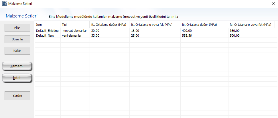 ) veya eleman özellikleri içerisinde olan Malzeme Setlerini Tanımla düğmesi yoluyla tanımlanabilir. Gereken malzemelerin özellikleri elemanın tipine (mevcut veya yeni) bağlıdır. Mevcut malzemeler için, ortalama mukavement değeri ve ortalama mukaement değeri eksi bir standart sapma gerekliylen, yeni malzemeler içinse, karakteristik mukavemet değeri atanmalıdır. Varsayılan ayar olarak, biri mevcut elemanlar için ve diğeri yeni elemanlar için olmak üzere iki malzeme tertibi vardır. Kullanıcılar, setlerin varsayılan değerlerini değiştirebilirler, modellemede ihtiyaçlarına göre yeni setler tanımlayabilirler (ör. yapısal sisteme farklı mukavemette malzemelerin uygulanması).