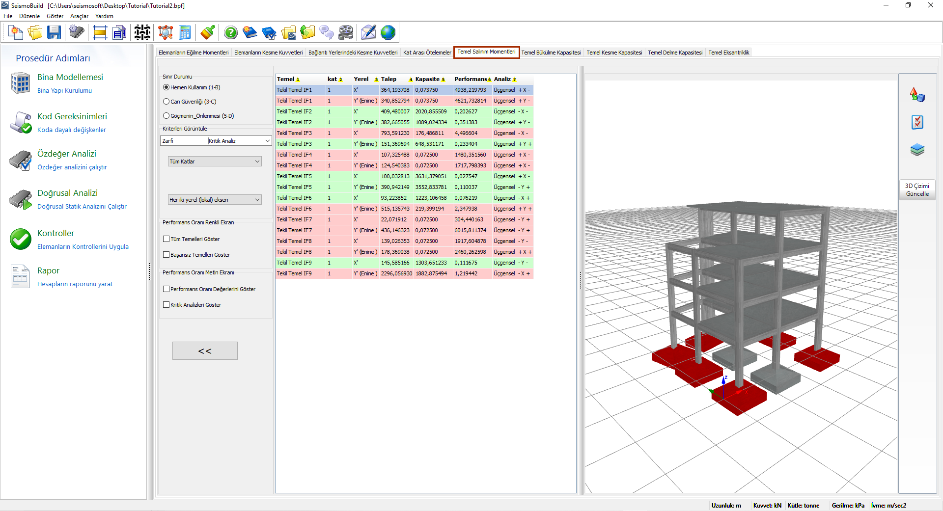 Seçilen Yönetmeliğe göre bireysel ve sürekli temeller için sallanma momenti kapasitesi kontrollerinin sonuçları bu modülde görselleştirilebilir. Kullanıcılar, sonuçların hangi Limit Durumu veya Performans hedefi için görüntüleneceğini seçebilir ve analizin, tabanın ve yerel eksenin belirlenmesini içeren filtreleri seçebilir. Kullanılabilir sınır durumları, Kod Gereksinimleri’nin Sınır Durumları modülünde zaten seçilmiş olanlardır. Ayrıca yapılan analizlerin dışında analiz seçimi için açılır menüde tüm analizlerin sonuçlarının zarfı olan Kritik Analiz adı verilen bir seçenek bulunmaktadır. Sallanma momenti kapasitesini aşan elemanlar hem tablo görünümünde hem de 3D görünüm formatında kırmızı ile işaretlenir ve farklı görselleştirme seçenekleri mevcuttur. Örneğin kullanıcılar, temellerin performans oranlarını veya her bir temelin kritik analizini 3 boyutlu grafikte görüntülemeyi veya seçilen limit durumu için performans oranlarının değerine bağlı olarak temelleri farklı renklerle görüntülemeyi seçebilir.