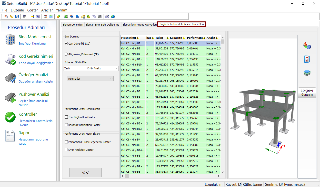 Buradan, kolon-kiriş birleşim bölgeleri için seçili Koda göre takip edilen kesme kuvveti kontrollerinin sonuçları aktarılır(bu kontrol Eurocodes, ASCE 41-23 ve TBDY için geçerlidir) . Kullanıcılar, sonuçların görüntüleneceği Sınır Durumu’nun (veya Performans Hedefine) yanı sıra analize, kata, eleman tiplerine ve yerel eksenlere hüküm verecek olan filtrelemelere de karar verirler. Mevcut sınır durumları, halihazırda Kod Gereksinimleri’nin Sınır Durumları modülünde tanımlı olanlardır. Ayrıca, ilgili aşağı çekilen menüde, çalıştırılan analizlerin yanı sıra bir de tüm analizlere ait sonuçların bir zarfının sunulduğu Kritik Analiz seçeneği de mevcuttur. Kesme kuvvetlerinin aşıldığı birleşim noktaları hem tablo, hem 3D görünümlerinde kırmızıyla işaretlenir,ancak farklı görselleştirme seçenekleri de mevcuttur. Örneğin kullanıcılar, elemanların performans oranlarını veya her elemanın kritik analizini 3D çizimde görüntülemeyi veya seçilen sınır durumu için performans oranlarının değerine bağlı olarak elemanları farklı renklerle görüntülemeyi seçebilir.