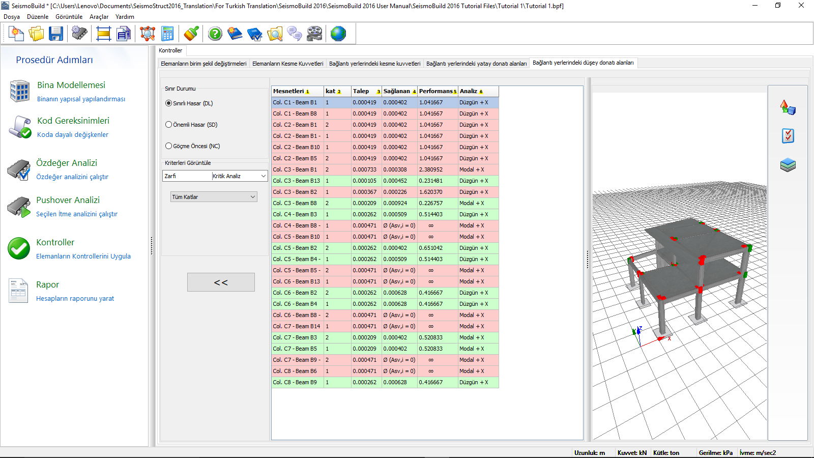 Buradan, kolon-kiriş birleşim bölgeleri için seçili Koda göre takip edilen düşey donatı alanı kontrollerinin sonuçları aktarılır (Bu kontrol yalnızca Eurocode 8 için geçerlidir). Kullanıcılar, sonuçların görüntüleneceği Sınır Durumu’nun (veya Performans Hedefine) yanı sıra analize, kata, eleman tiplerine ve yerel eksenlere hüküm verecek olan filtrelemelere de karar verirler. Mevcut sınır durumları, halihazırda Kod Gereksinimleri ’nin Sınır Durumları modülünde tanımlı olanlardır. Ayrıca, ilgili aşağı çekilen menüde, çalıştırılan analizlerin yanı sıra bir de tüm analizlere ait sonuçların bir zarfının sunulduğu Kritik Analiz seçeneği de mevcuttur. Düşey donatı alanın Kodda belirtilen değerden küçük olan birleşim noktaları hem tablo, hem 3D görünümlerinde kırmızıyla işaretlenir,ancak farklı görselleştirme seçenekleri de mevcuttur. Örneğin kullanıcılar, bağlantı yerlerinin performans oranlarını veya her bağlantı yerinin kritik analizini 3D çizimde görüntülemeyi veya seçilen sınır durumu için performans oranlarının değerine bağlı olarak bağlantı yerlerini farklı renklerle görüntülemeyi seçebilir.