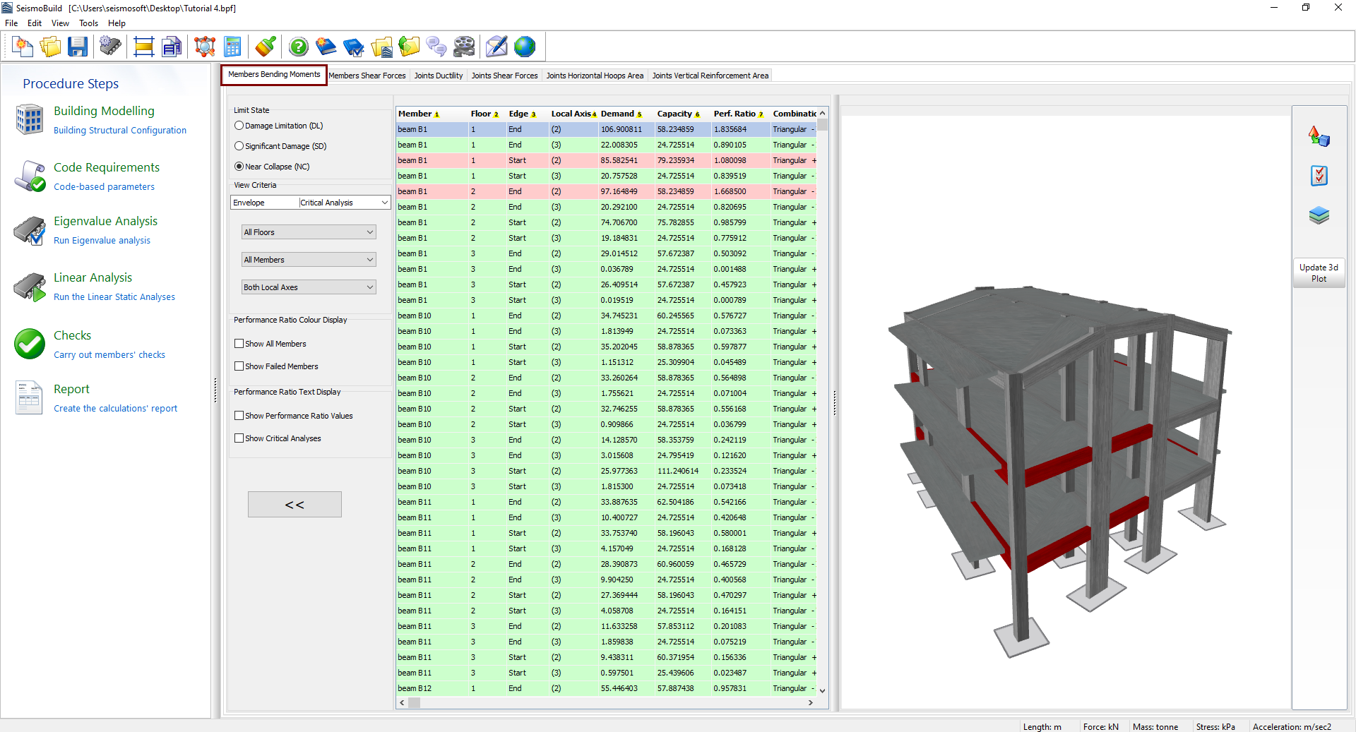 Burada, seçilen Kod'a göre kirişler, kolonlar ve duvarlar için eğilme momenti kontrollerinin sonuçları dışa aktarılır. Kullanıcılar sonuçları görüntülemek için Sınır Durumu veya Performans hedefi için seçim yapabilir ve analizin, katların, elemanlarının tipinin ve yerel eksenin belirlenmesini içeren filtreleri seçebilir. Kullanılabilir sınır durumları, Kod Gereksinimlerinde Sınır Durumları modülünde zaten seçilmiş olanlardır. Ayrıca, yürütülen analizler dışında analiz seçimi için açılır menüde, tüm analizlerin sonuçlarının zarfı olan Kritik Analiz adlı bir seçenek vardır. Eğilme momenti kapasitesini aşan elemanlar hem tablo görünümünde hem de 3D görünüm formatında kırmızı ile işaretlenir, farklı görselleştirme seçenekleri mevcuttur. Örneğin kullanıcılar, elemanların performans oranlarını veya her elemanın kritik analizini 3D çizimde görüntülemeyi veya seçilen sınır durumu için performans oranlarının değerine bağlı olarak elemanları farklı renklerle görüntülemeyi seçebilir.