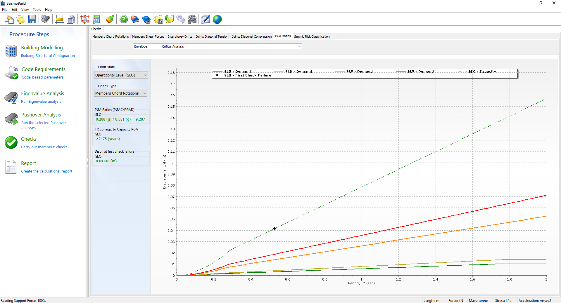 PGA oranları (yalnızca NTC'de mevcuttur) bir yapının dayanabileceği pik yer ivmeleri açısından yapının zarar görebilirliğine genel bir bakış açısı sağlar; dolayısıyla sismik riskin bir ölçüsüdür. Sismik Etki sekmesinde kullanıcı tarafından belirtilen Spektral ivmeye karşılık gelen PGA Kapasitesinin oranı ilk arızanın (yapının herhangi bir elemanında) meydana geldiği Kapasite Eğrisi üzerindeki yer değiştirmenin PGA Talebine bölümü olarak tanımlanır. PGA oranı, her sınır durumu, kontrol tipi ve itme (pushover) analizi için hesaplanır. Birden büyük değerler (yeşil renkle gösterilir), seçilen sınır durumu, kontrol tipi ve analiz kombinasyonu için herhangi bir hasar olmadığını gösterirken, birden küçük değerler durumunda (kırmızı renkle) hasar beklenir. Birden önemli ölçüde büyük değerler, Kod'un gerektirdiği sismik etkiden oldukça büyük sismik yüklere dayanabilen bir yapıyı gösterirken sıfıra yakın değerler, Kod'un gerektirdiği kapasiteden önemli ölçüde daha düşük kapasiteye sahip bir yapıyı belirtir. PGA oranları sekmesinde, talep ve kapasite yer değiştirme tepki spektrumları da grafik olarak gösterilir ve ilk kontrol arızasındaki yer değiştirme belirtilir. PGA kapasitesine karşılık gelen dönüş periyodu da gösterilmektedir.