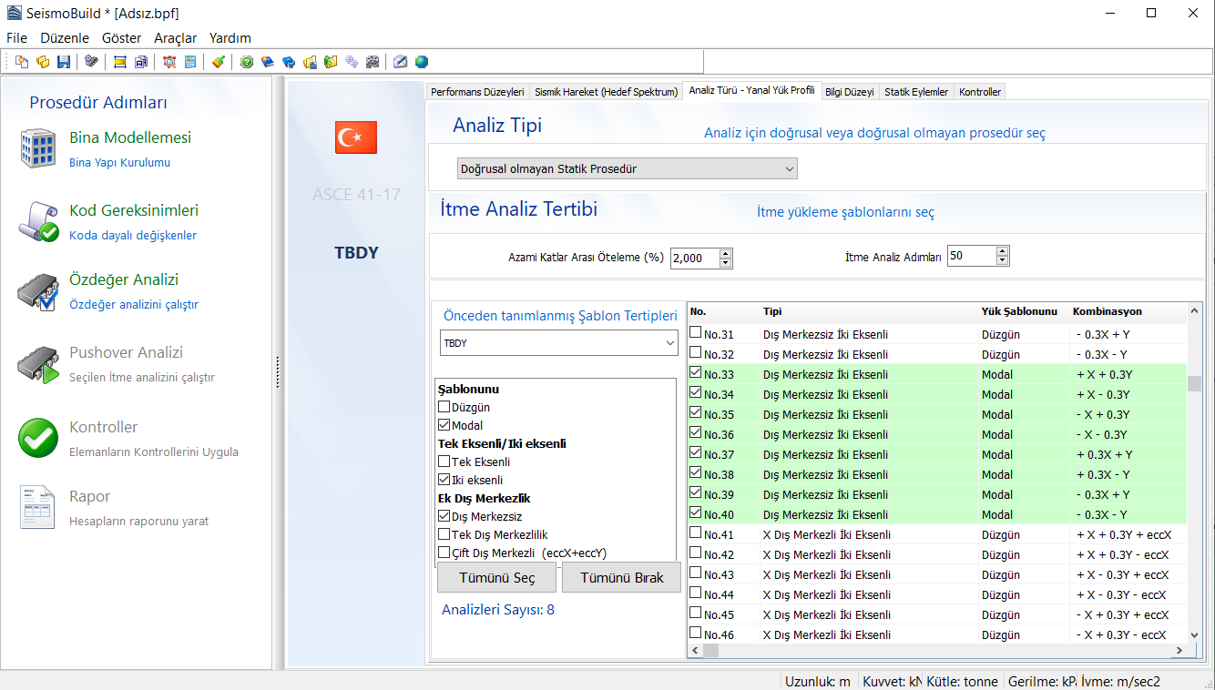 - İkincisi, ilgili işaret kutucukları vasıtasıyla kullanıcı tanımlı yükleme tertiplerinin seçilmesidir. Kullanıcılar düşey kuvvetlerin etkimesi (düzgün veya modal şekilde) , yatay kuvvetlerin iki doğrultuda eş zamanlı etkiyip etkimemesi ve Tekli veya çoklu dışmerkezliliğin mevcudiyeti konusunda karar verebilirler.