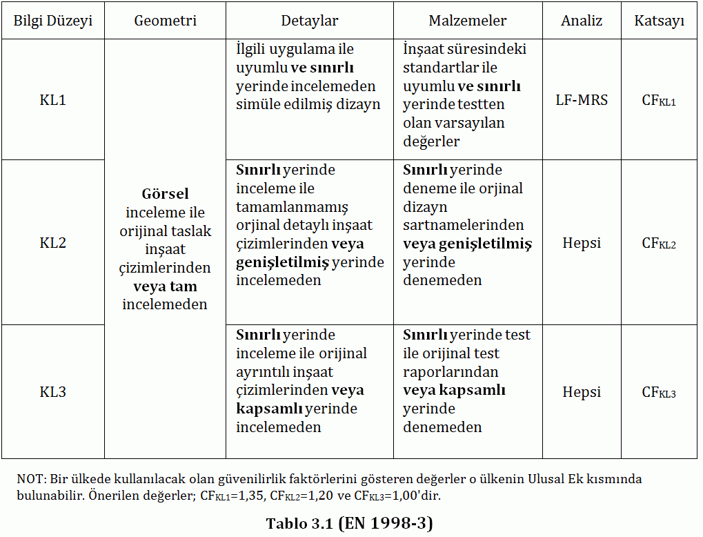 Aşağıda gösterilen EN1998-3 tablosunda, her bir bilgi düzeyi için olmak üzere, güvenilirlik faktörleri ve analiz yöntemleri için öneriler ve bir özet bulunmaktadır.