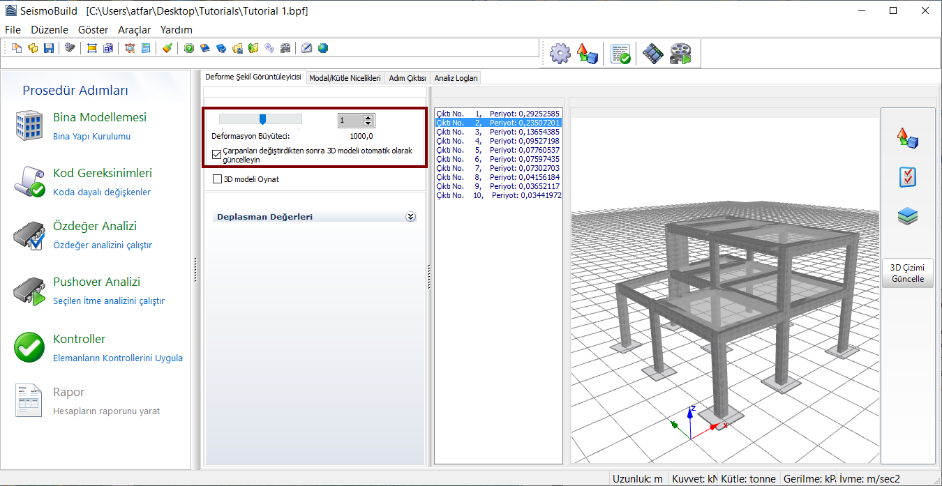 Deforme Şekil Görüntüleyicisi, kullanıcılara her bir periyota ait deforme olmuş geometrinin görüntülenmesini sağlar (istenilen çıktı ismine/tanımlayıcısına çift tıklanarak deforme şekil güncellenir).