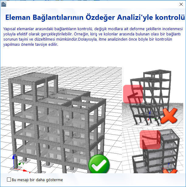 Analiz tamamlandığında, beliren mesajda olası bir eleman bağlantısı probleminin önüne geçmek için, farklı modlara ait deforme şekillerin kontrolünün yapılması önerilir.