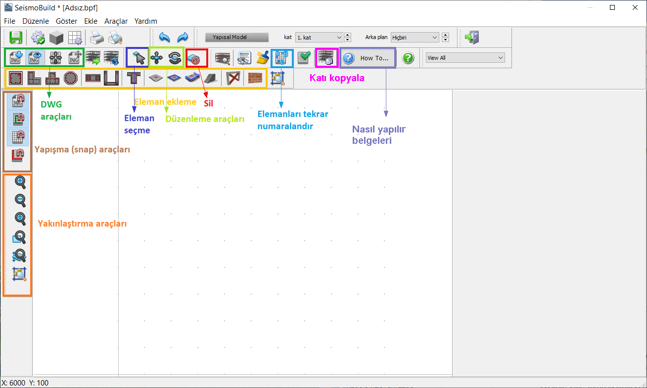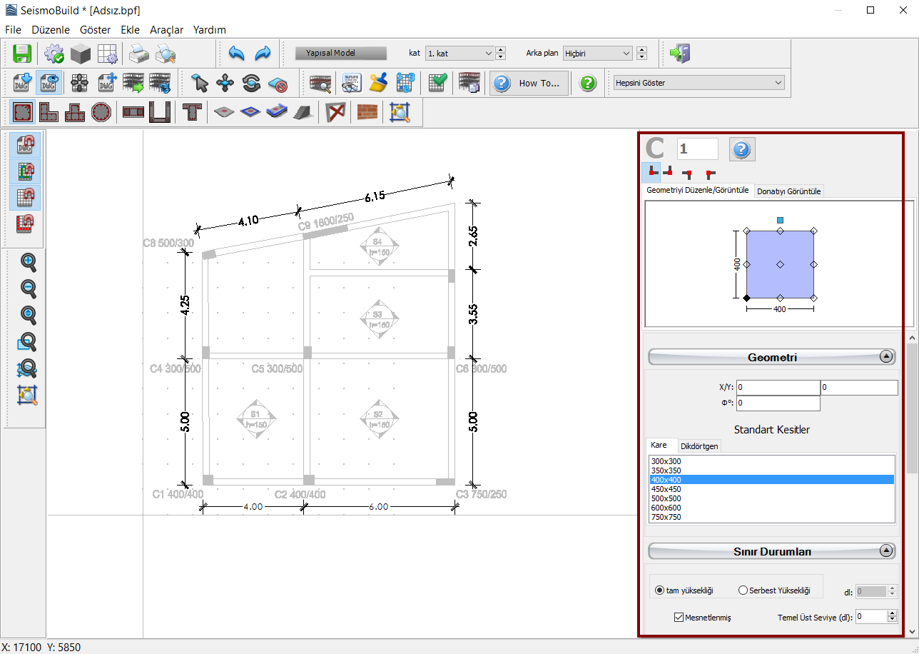 Kolon ve döşemelerin tanımı tek bir fare tıklaması gerektirir, duvarlar ve kirişler içinse iki noktanın tanımı gereklidir. Daha fazla bilgi için Eleman Eklenmesi/Düzenlenmesi'ne göz atınız.