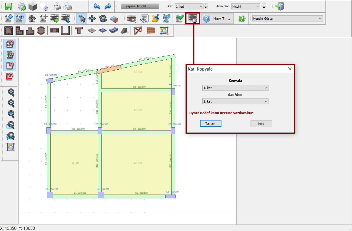 İlk kata ait elemanların tanımı tamamlandıktan sonra, diğer katlara kopyalanabilir.