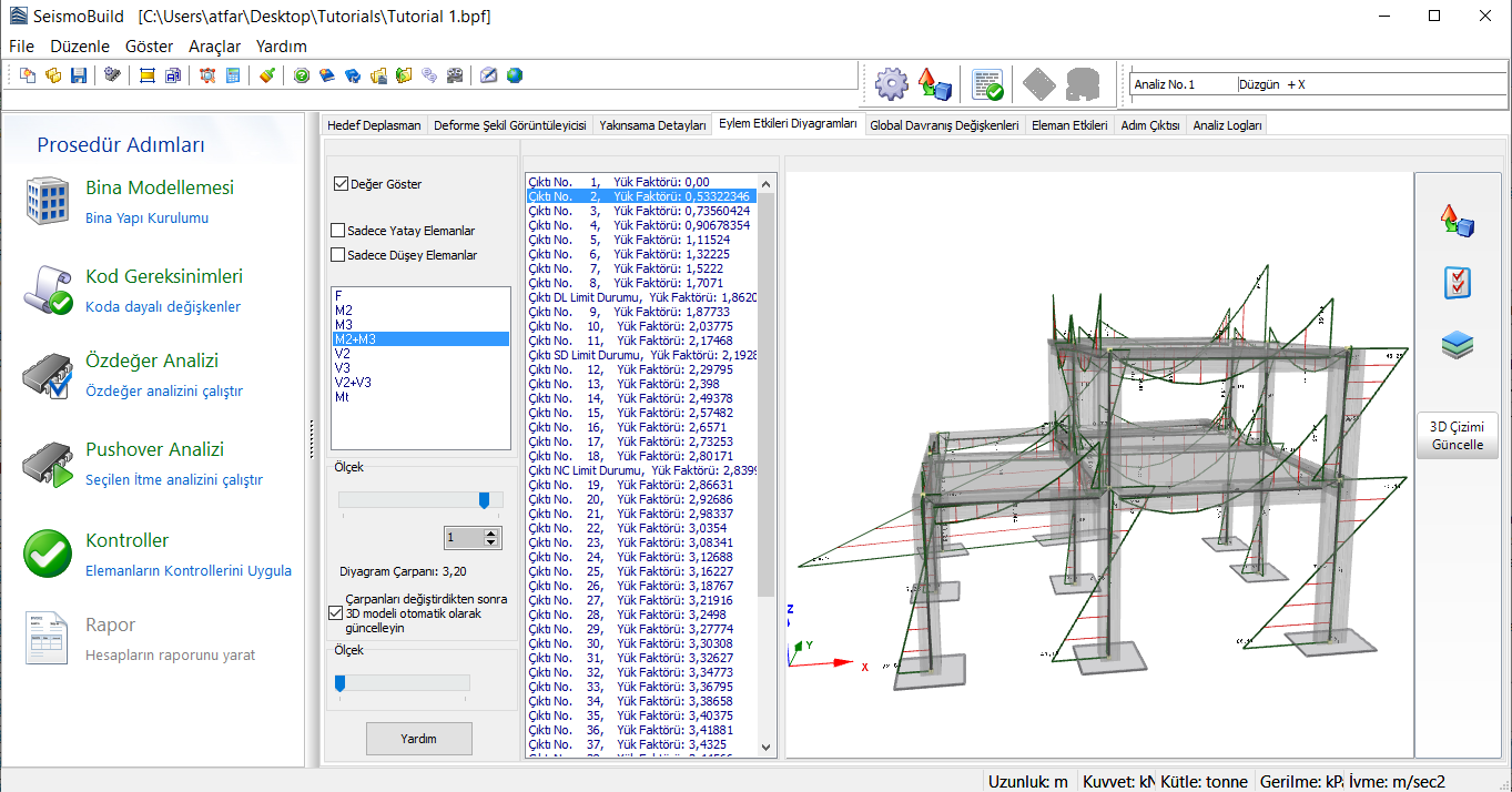 Çerçeve elemanlarda meydana gelen kesit kuvvet ve moment diyagramları 3D olarak gösterilir. Düşey ve yatay elemanların diyagramları aynı çizim içeriside yer alır. Kullanıcıların yatay ve düşey eleman diyagramlarını ayrı çizdirmek istemeleri durumunda, ilgili onay kutusunu işaretlemeleri gereklidir. Çizgilerin kalınlığı ve diyagram ölçeklendirme olanağı da mevcuttur.
