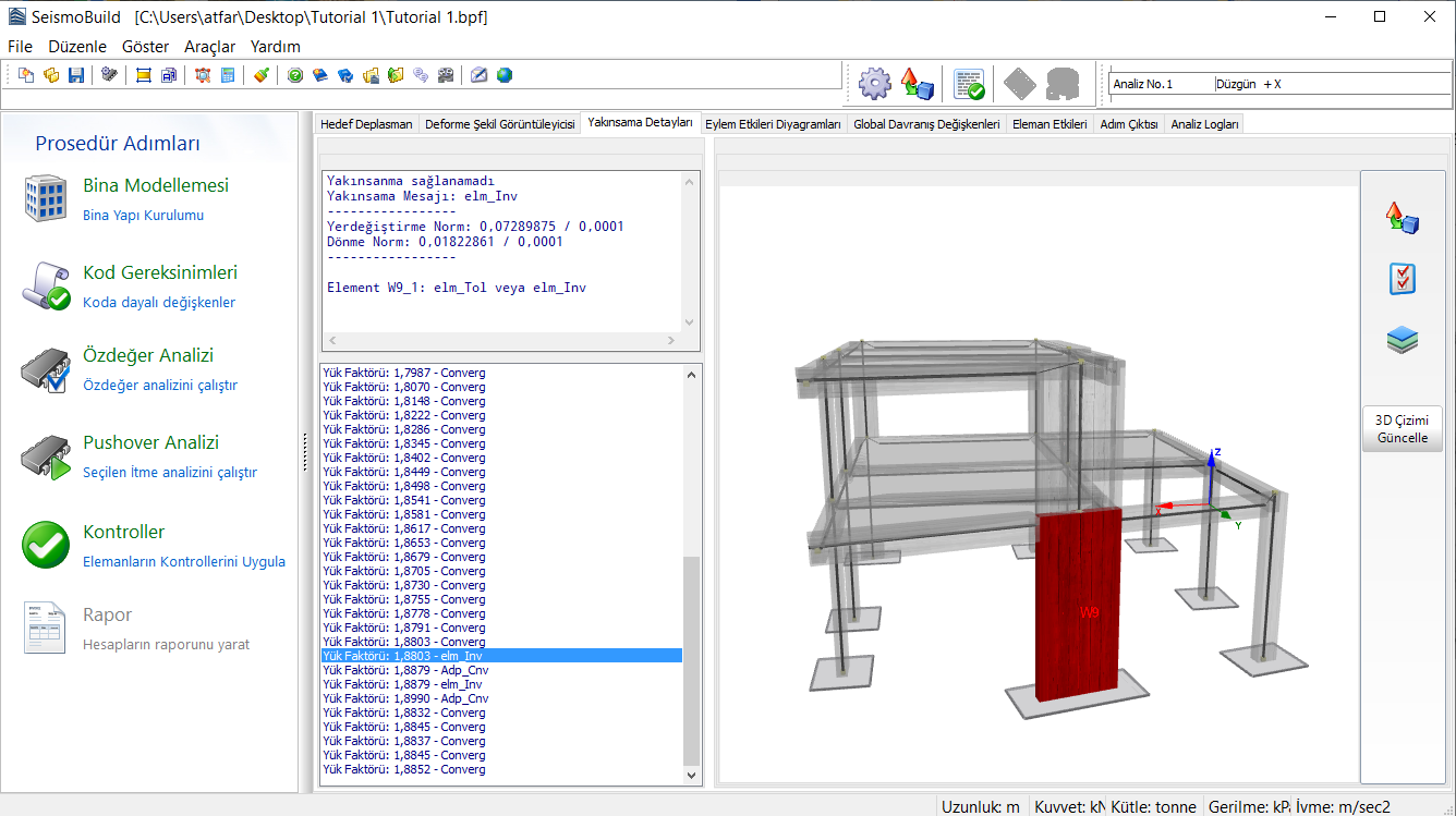 Yakınsama sorunları ortaya çıktığında, kullanıcılar sapan çözümlere neden olan unsurlar hakkında bilgilendirilebilir. Yakınsama sorunlarının meydana geldiği yapı elemanları veya konumları 3D görünüm formatında işaretlenirken, sapmanın türü ile ilgili bilgiler (yakınsama normlarının değeri ve sınırları, sapma mesajı ve karşılık gelen elemanlar veya düğümler) ekranın sol üst köşesinde görüntülenir.
