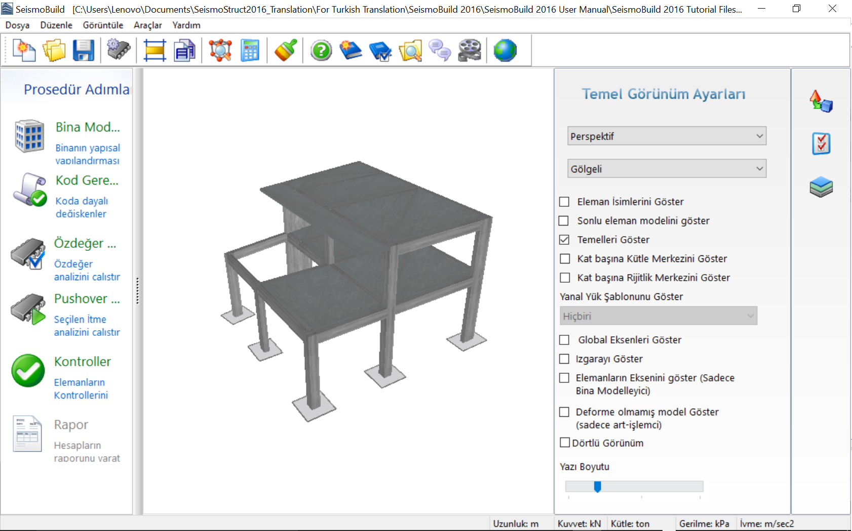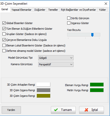 Kullanıcı, 3D Çizim Seçenekleri menüsünün içerisinde görüntülemek üzere model bileşenlerini (düğüm, çerçeve, kütle/sönümleme elemanları, vb.) seçebilir ve elemanların renk/geçirgenlik özellikleri, arkaplan panelleri, çizim eksenleri, yük sembollerinin renk/geçirgenliği, yazı karakter renk seçimi gibi birçok görüntüleme özelliğine müdahale edebilir.