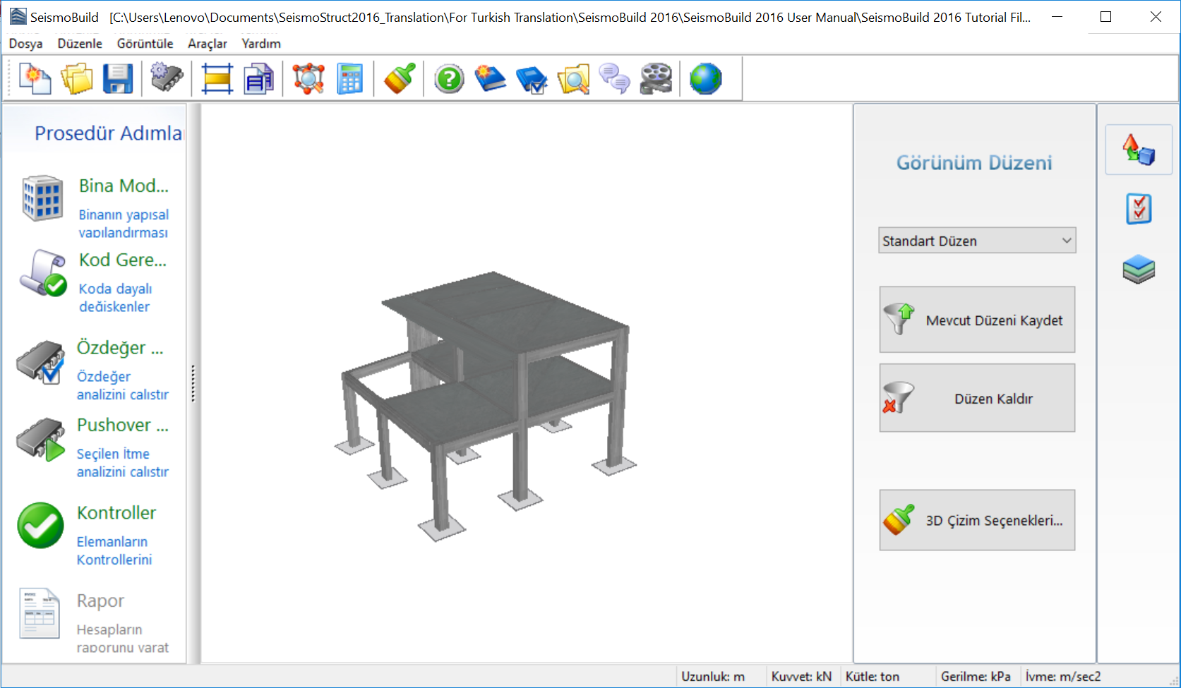 düğmesi yoluyla ulaşılabilen bu serviste kullanıcılar (i) ön tanımlı bir düzen seçebilir; ör: Standart Düzen (öntanımlı), Geçirgen elemanlar ve Çizgi elemanlar (sondaki özellikle kesit tesirlerinin görüntülenmesinde oldukça kullanışlıdır), (ii) kendi kişisel Görüntüleme Düzenlerini kaydedebilir ya da (iii) 3D Çizim Seçeneklerini değiştirebilir.
