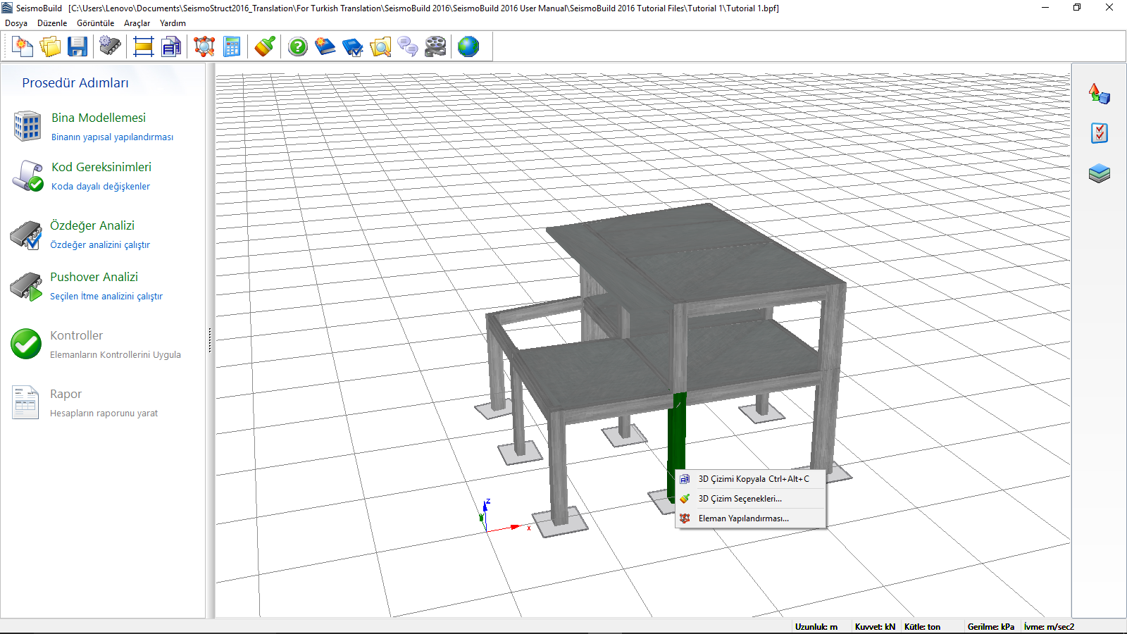 Kullanıcılar, fare (tavsiye edilen), klavye kısayolu yoluyla (bkz. burası) kolayca modele yakınlaşıp/uzaklaşabilir, modeli döndürebilir ve(ya) 2D/3D çizimi hareket ettirebilir. Ayrıca, elemanları işaretleyip seçmek yoluyla Bina modelleyicisi’ne hızlıca erişmek ve buradan elemanlara ait özellikleri görüntüleyip değiştirmek ve sağ tıklayarak “Eleman Yapılandırması” nı seçmek mümkündür.