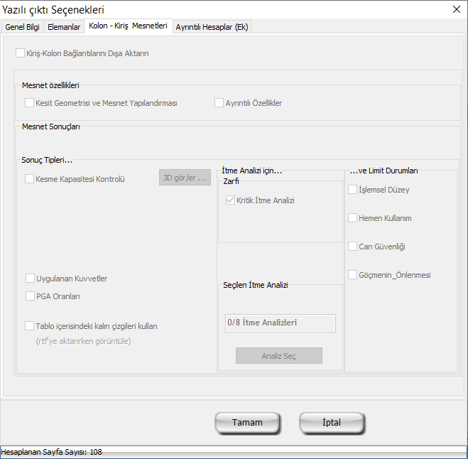 Bağlantı noktasının geometri ve kuruluyla ilgili rapora aktarılmak istenen detaya kullanıcı karar verir. Aktarılan sonuçlar, seçilen koda göre farklılık gösterebilir. Son olarak, sonuçların aktarılacağı sınır durumları ve karşılık gelen 3D Çizimler de tanımlanır.