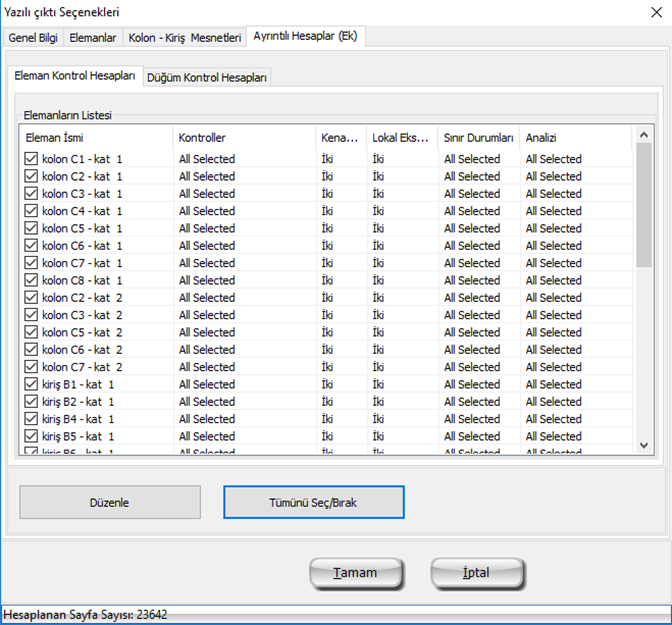 Seçili Kod’da belirtilen denklemlere göre detaylı olarak takip edilen Eleman Kontrolleri teknik rapora aktarılabilir. Kullanıcılar, eleman bazında seçilecek olacak sonuçları isteklerine göre düzenleyebilir. Bu iişlem için ilgili elemanlar seçilir, 'Düzenle' düğmesine tıklanır ve kontrol tipi, kenarı, ekseni, sınır durumu ve itme analizi seçilir.