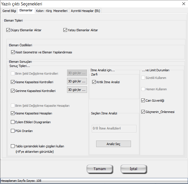 Rapora aktarılması istenen eleman özellikleri de seçilebilir. Ayrıca, istenilen analiz ve sınır durumu için rapora aktarılacak olan kontrol sonuçları da tayin edilebilir.