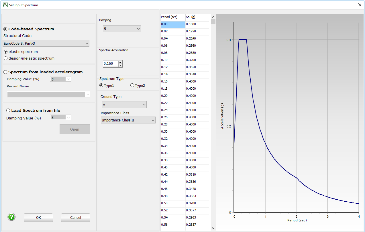 - NCSE-02 - Spanish Code spectrum: The spectrum defined in the Spanish Code for Earthquake Resistant Structures (NCSE - 02). For the elastic spectrum calculation the user needs to define the damping parameter, the Ground Type (A to E), the spectral acceleration, the Importance Class (I to II) and the Contribution Factor (K). For the calculation of the design spectrum the user needs to define the reduction factor for ductility. The details and relationships for the spectrum calculations can be found in chapters 2 and 3.7.3 of the NCSE-02.
