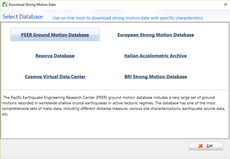 A connection to the most well-known on-line earthquake record databases is available. In order to find the available links, users should select the Tools > Download Strong Motion Data menu command (or the respective toolbar button