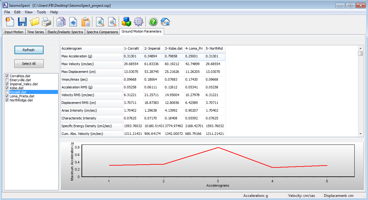 In this module, a number of commonly computed ground motion parameters are provided, as specified in the Program Settings panel. Users are referred to the work by Kramer [1996] for a detailed description and discussion on the employment of such ground motion quantities. By selecting one of the ground motion parameters from the mentioned table, the results for each matched accelerogram will be show on the chart given at the bottom of the module window.