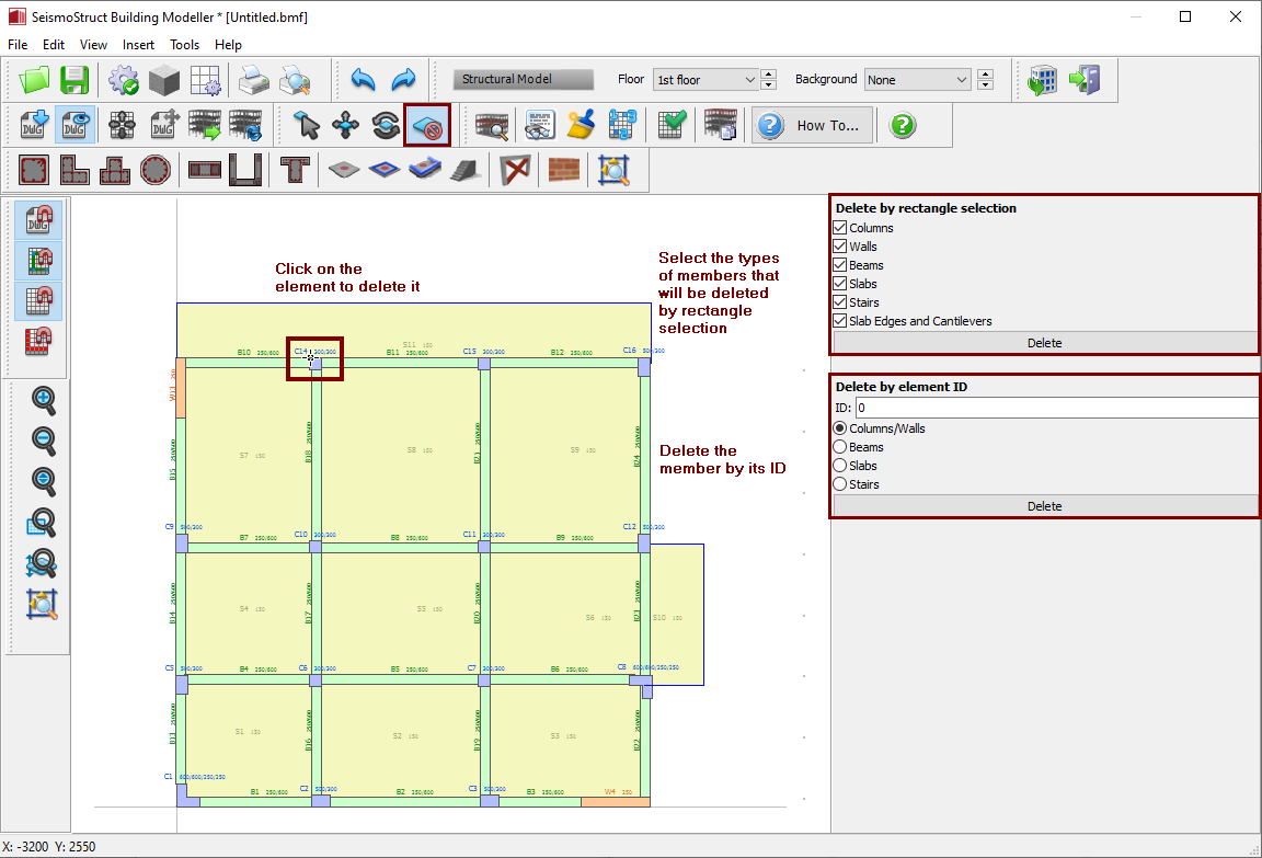 It is noted that there is a number of ways to delete elements: (i) by clicking on the element (ii) by its name (select the member's type, assign its number ID and click the Delete button) or (iii) by selecting a rectangular area on the Main Window (select the member types that will be deleted, select an area of the model on the Main Window and click the Delete button).