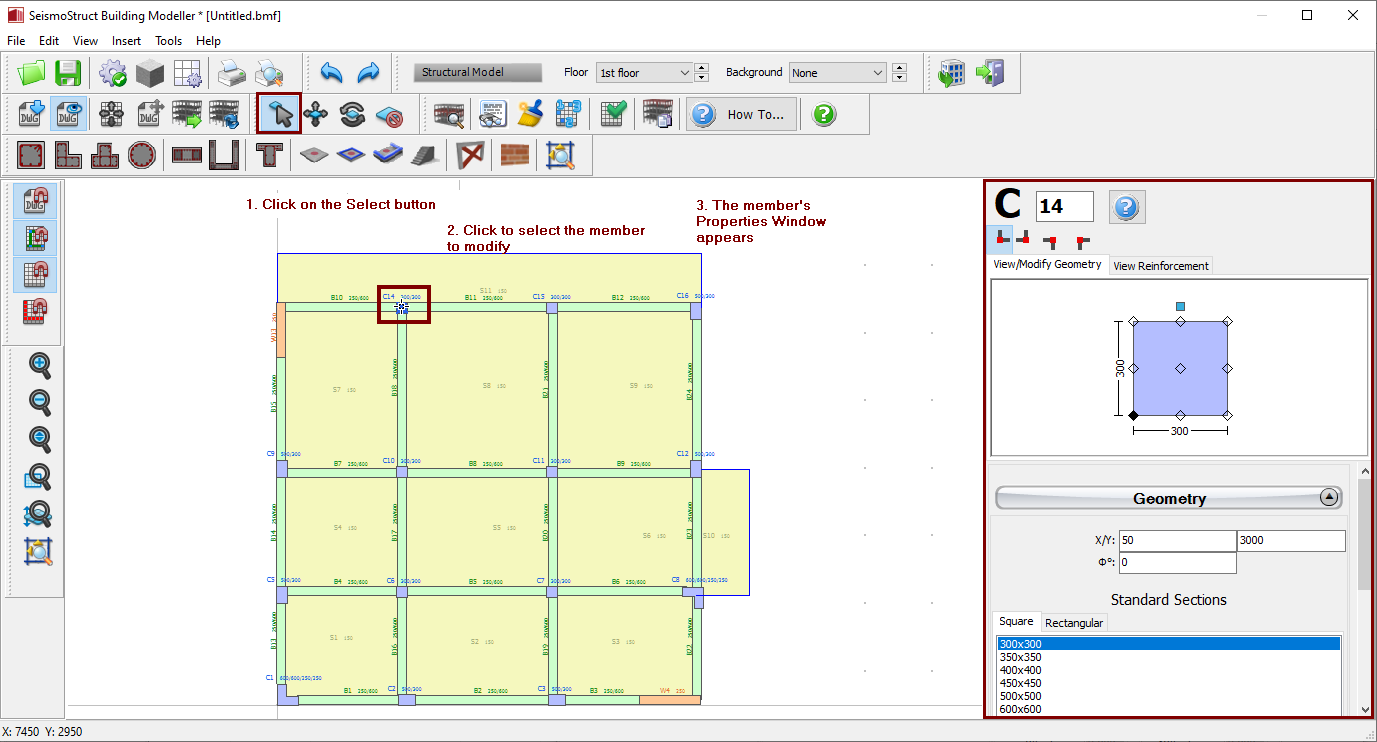 All the structural members can be further modified after their insertion. Users should first use the Select tool from the Menu (Tools > Select) , through the corresponding toolbar button