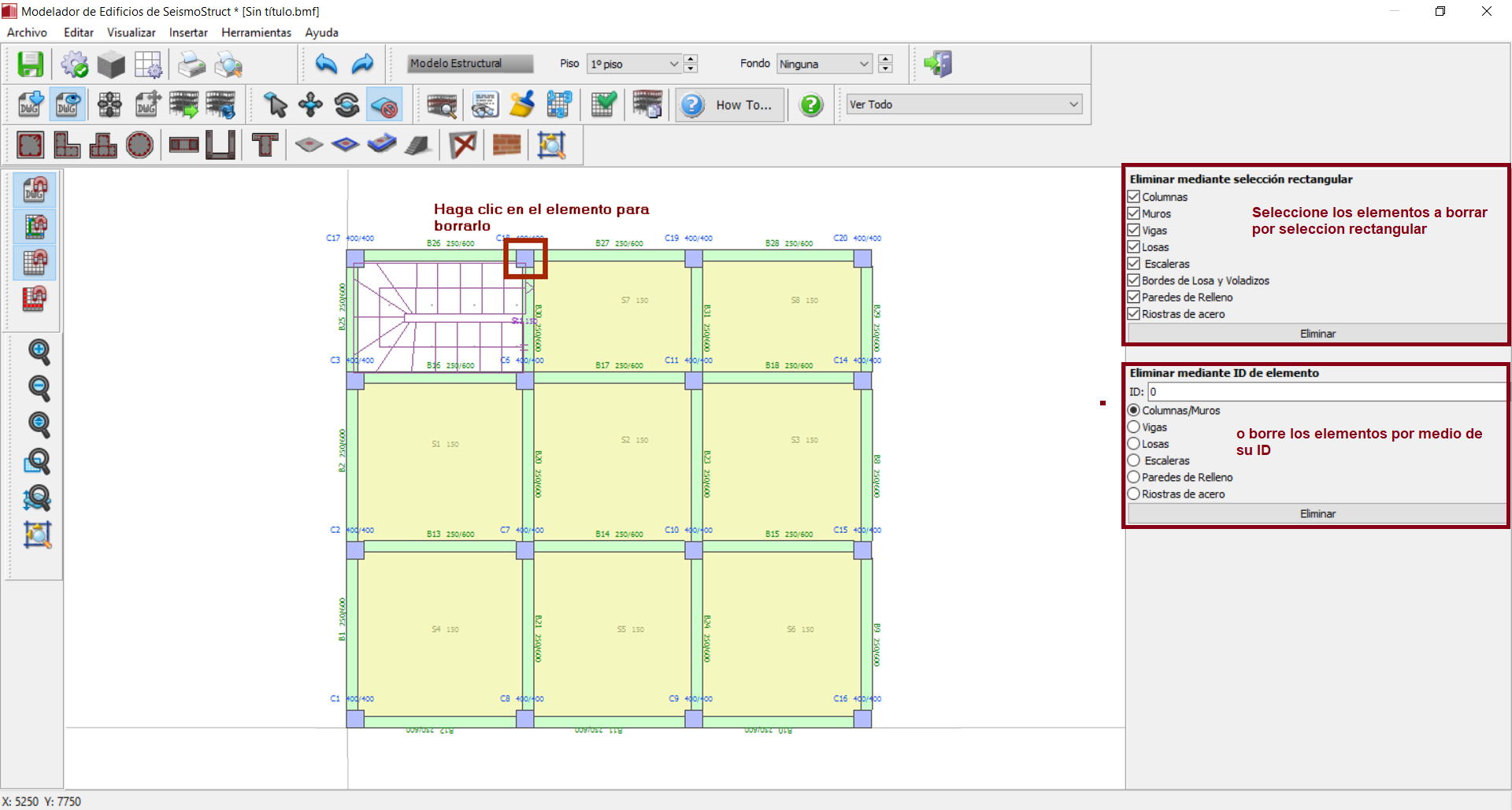 Nótese que hay varias maneras de borrar elementos: (i) haciendo clic en el elemento (ii) por su nombre (seleccionando el tipo de miembro, asignando su número de ID y haciendo clic en borrar) o (iii) seleccionando un área rectangular en la Ventana Principal (seleccione los tipos de miembro que serán borrados, seleccione un área de el modelo en la Ventana Principal y haga clic en el botón de borrar).