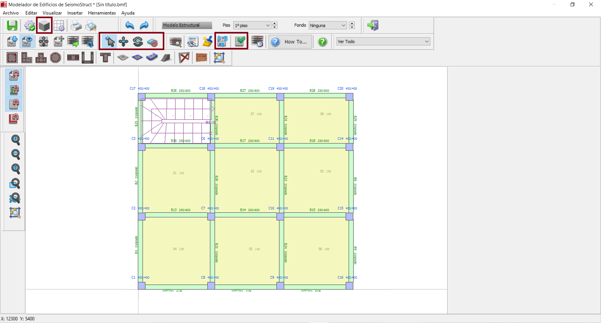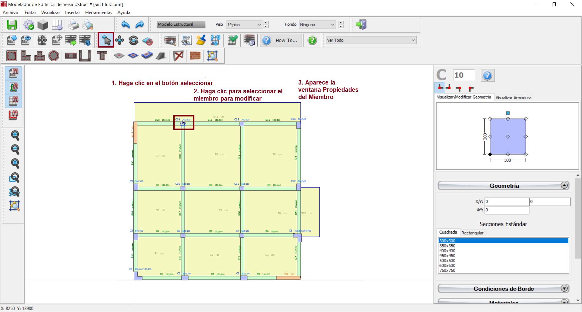 Todos los miembros estructurales puede modificarse luego de ser insertados. Los usuarios deben primero usar la herramienta de Seleccionar del Menú (Herramientas > Seleccionar), a través del botón correspondiente de la barra de herramientas
