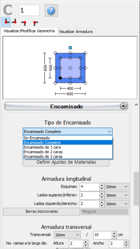Los encamisados se pueden aplicar a la sección en el área de Encamisado seleccionando el tipo de encamisado, es decir, si es un encamisado completo, de 1 cara, de 2 caras o de 3 caras, y asignando el conjunto de material y el refuerzo longitudinal y transversal del encamisado.