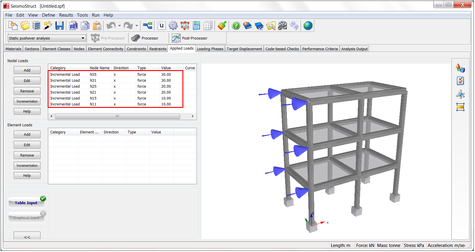 - When assessing the horizontal capacity of non-symmetric structures, users should take care to consider the application of the incremental loads in both directions (i.e. run two pushover analyses) in order to identify the capacity of the structure in both its "weak" and "strong" directions.