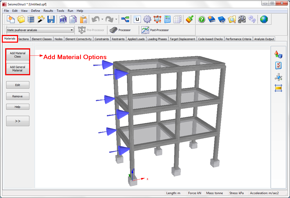 Materials that are to be available within a SeismoStruct project come defined in the Materials module, where the name (used to identify the material within the project), type (listed above) and mechanical properties (i.e. strength, modulus of elasticity, strain-hardening, etc.) of each particular material can be defined.