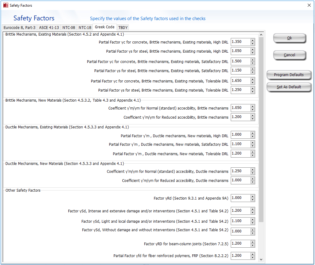The recommended values for the partial factors corresponding to the achieved data reliability level, as defined in section 4.5 of KANEPE, are introduced in the Safety Factors module. Users may edit the assigned values.