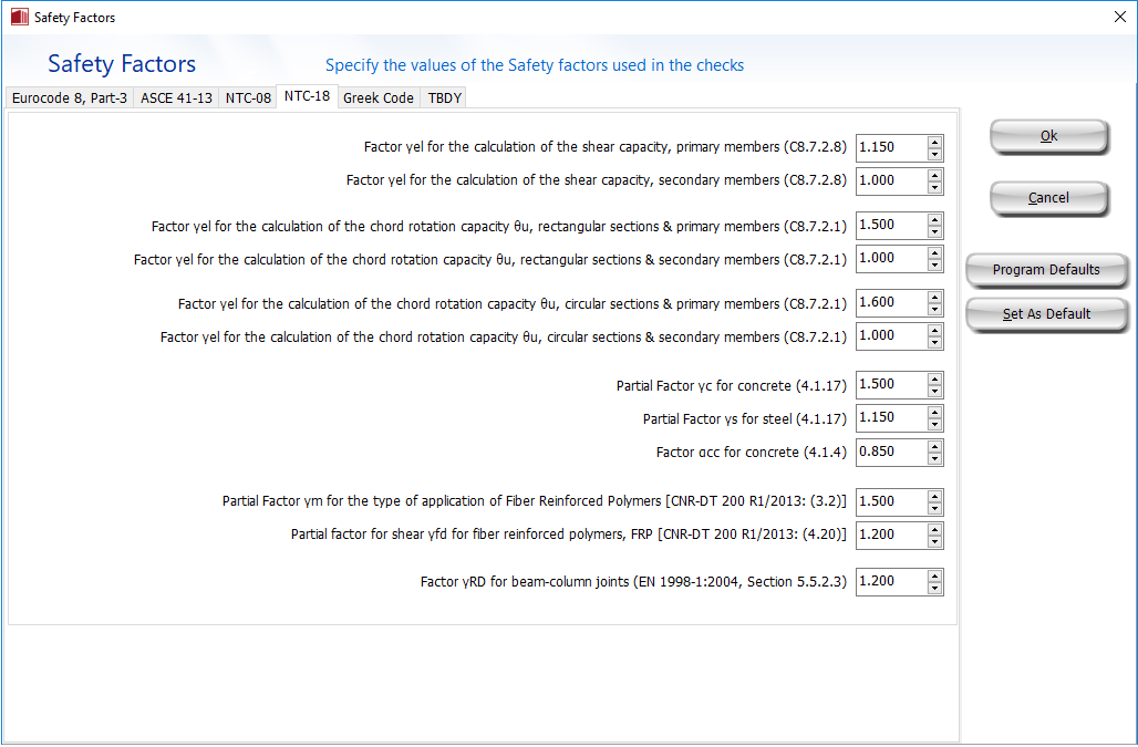 The recommended values for the safety and partial factors, as defined in NTC-18, are introduced in the Safety Factors module. Users may edit and change the default values.