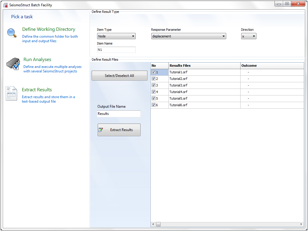 Users may extract simultaneously and for all the selected analyses the analysis results that they need. The results will be stored in the output file name, which is a text-based file with results arranged in columns (one pair of data columns, e.g. time & displacement, for each of the analyses). The output file can be opened with any text editor or a spreadsheet application, such as Microsoft Excel.