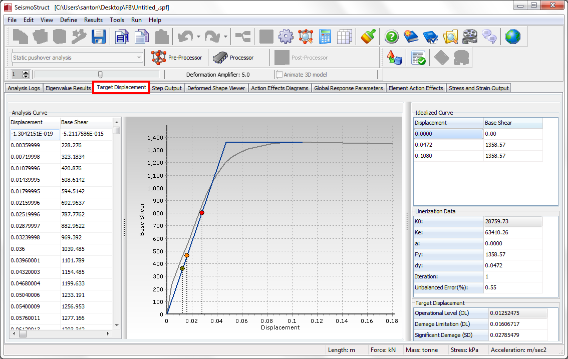 In the Target Displacement module the capacity curves before and after linearisation are shown, together with the calculated target displacements for the selected limit states. Data about linearisation and the target displacement calculation are also provided herein. The linearisation procedure is always carried out according to the methodology proposed by the selected Code. Users may refer to here for more information about the calculation of the target displacement.