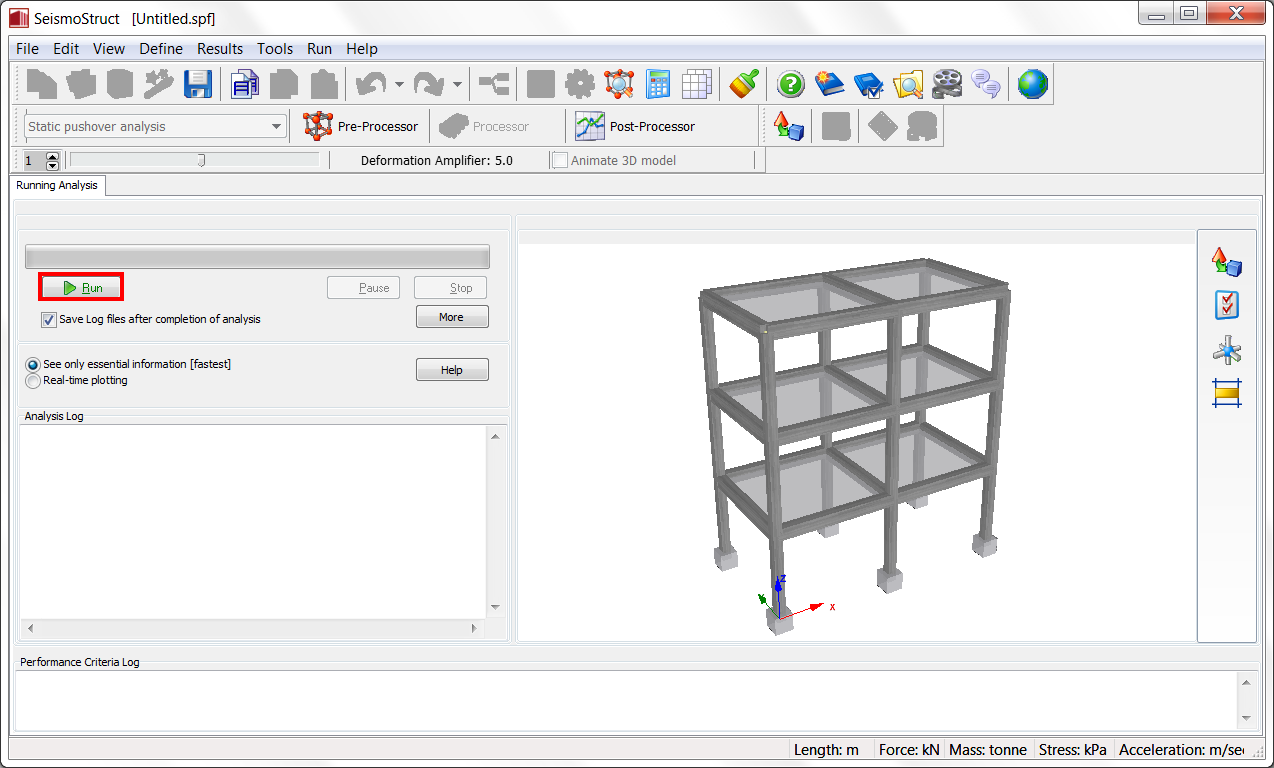 Finally, the user has also the option of graphically observing the real-time plotting of a capacity (static pushover) or displacement time-history (time-history analysis) curve of any given node and respective degree-of-freedom, pre-selected in the Output module. This option, however, might slow down the analysis and increase its running time when used in relatively slow computers, for which reason the user has also the possibility of simply disabling any real-time plotting, choosing to follow only the analysis logs. Furthermore, displaying of the latter can also be disabled (pressing the Less button) so as to attain even faster performance (on modern fast computers, however, the difference should be completely negligible).