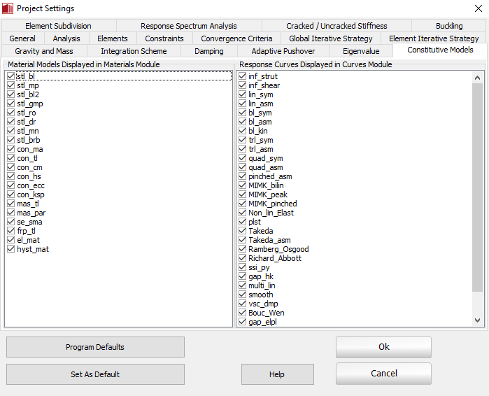 Herein, material models and response curves that will be displayed in Materials module and Element Classes module, respectively, can be activated.