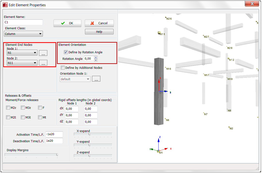 The different elements of the structure are defined in the Element Connectivity module, where their name, element class, corresponding nodes, rigid offsets, force/moment releases and eventually activation time/L.F. are identified.